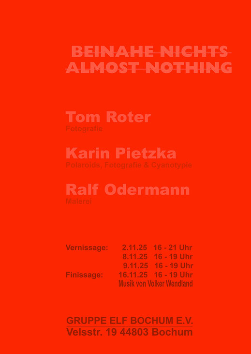 Ralf Odermann, Karin Pietzka und Tom Roter eröffnen am 2.11.2025 um 16.00 Uhr im Atelierhaus der Gruppe Elf in Bochum ihre gemeinsame Ausstellung mit Interpretationen zum Thema „BEINAHE NICHTS“.